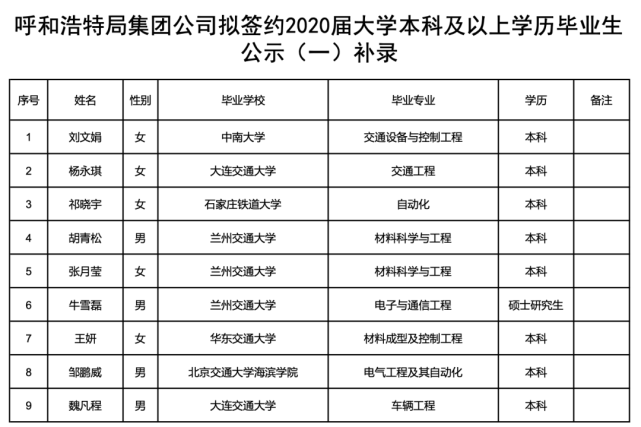 206人 呼和浩特铁路局录取名单出炉 呼和浩特铁路局 呼和浩特 中国铁路 学历 大学本科 补录